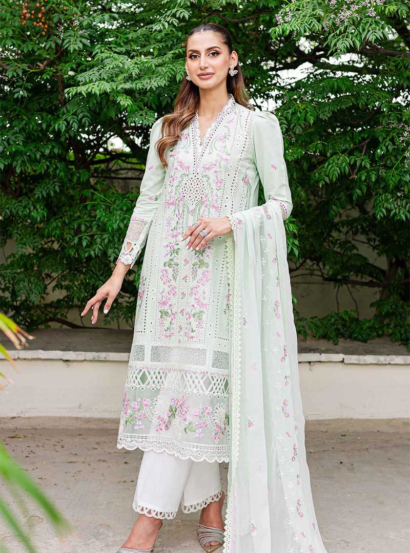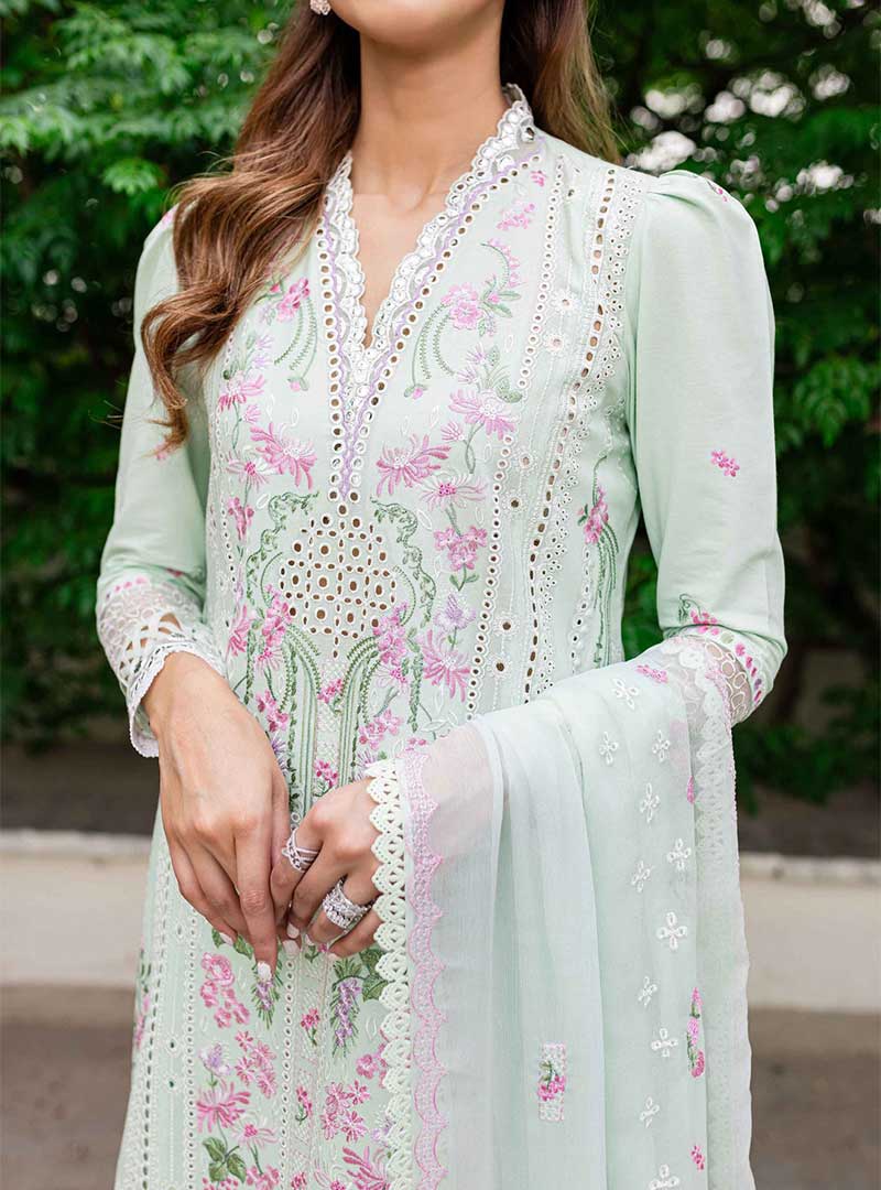 Mint Garden from the front features intricate embroidery on aqua green lawn fabric, with attention to detail on the center, left, and right panels. The neckline and hem borders are delicately embroidered on aqua-green organza, complemented by imported lace for the daman. The back showcases a dyed aqua-green lawn fabric with embroidered borders. The sleeves are adorned with embroidery and organza borders. The dupatta is crafted from aqua-green chiffon with exquisite embroidery. Completing the ensemble is a white cotton trouser for a timeless appeal.